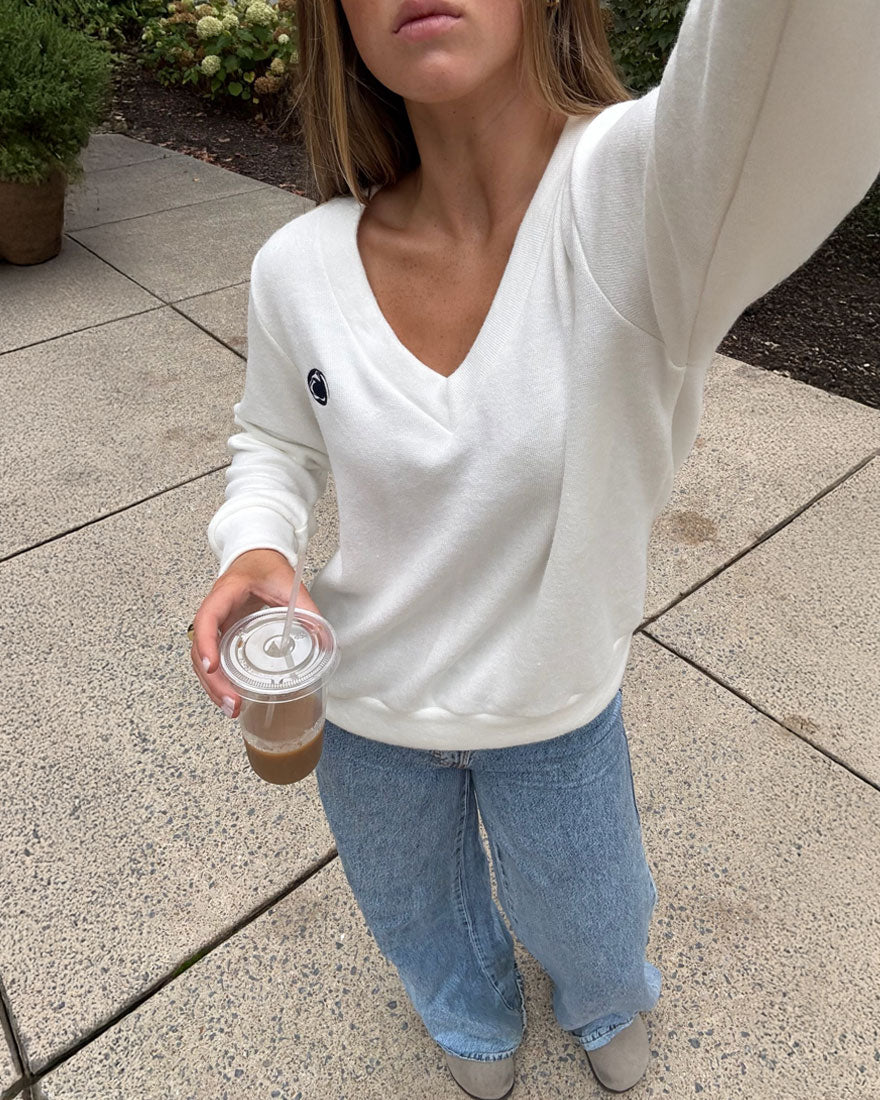 Limited edition and made to last. This casual-fit V-neck sweater offers just the right plunge for a flattering neckline, finished with ribbed cuffs and hem for a uniform finish. Knit in a luxe yet lightweight synthetic blend, it delivers softness with the right amount of substance—thick enough to never be see-through. Destined to be your forever favorite, this White Out layer is game-day ready and effortless enough for everyday wear.