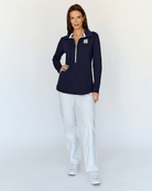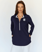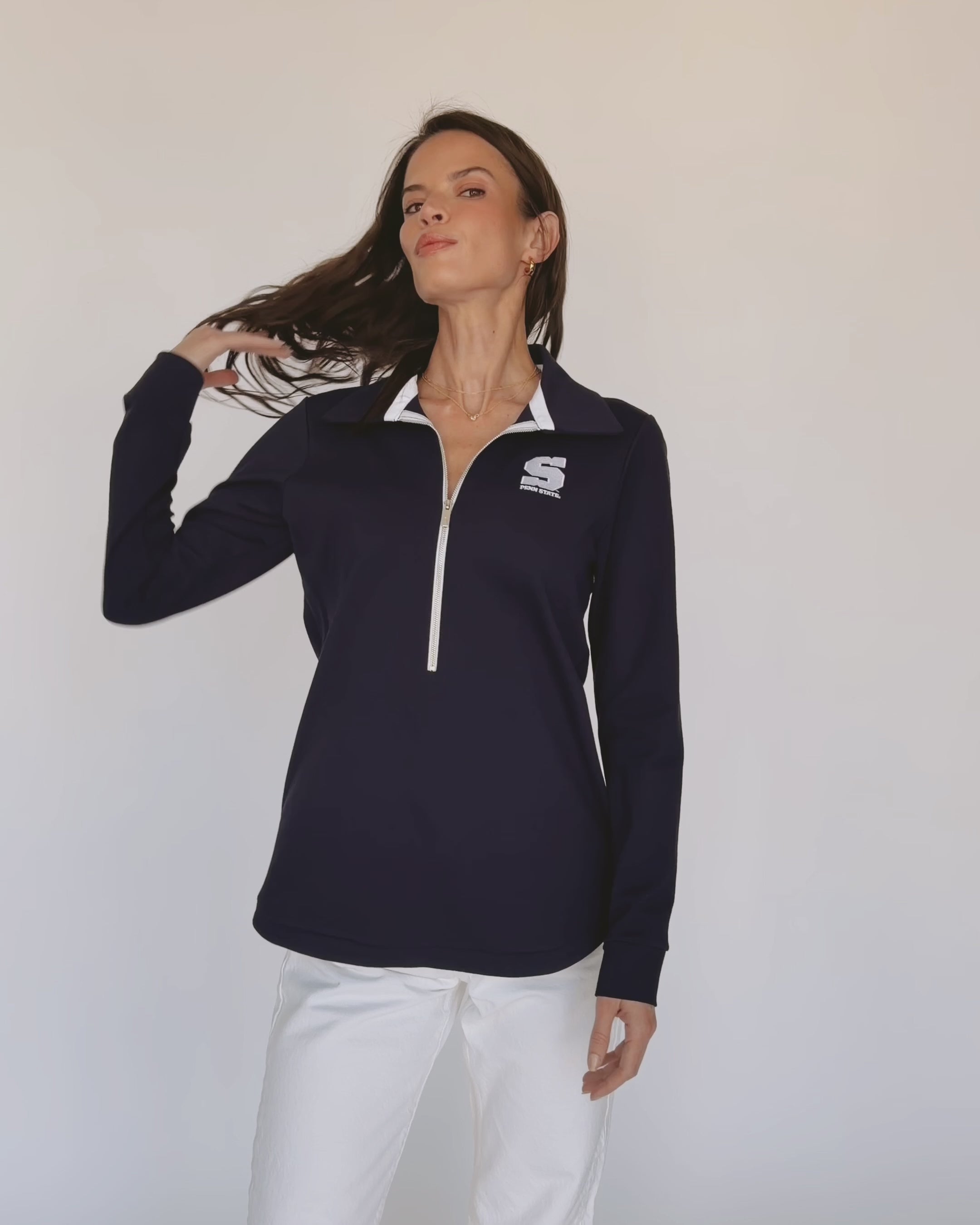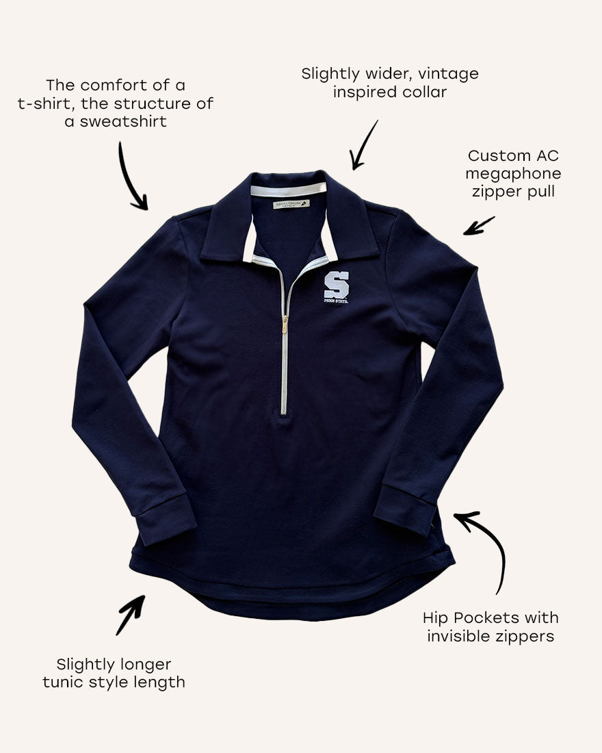 Your new long-sleeve essential. The Solid Penn State Polo leans sleek with its clean finish, sharp collar, and half-zip accented by the bold “S” emblem. Hip pockets come in handy on chilly mornings, and the soft tunic-length shape pairs effortlessly with jeans or travel-ready separates.