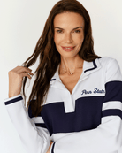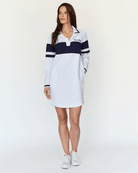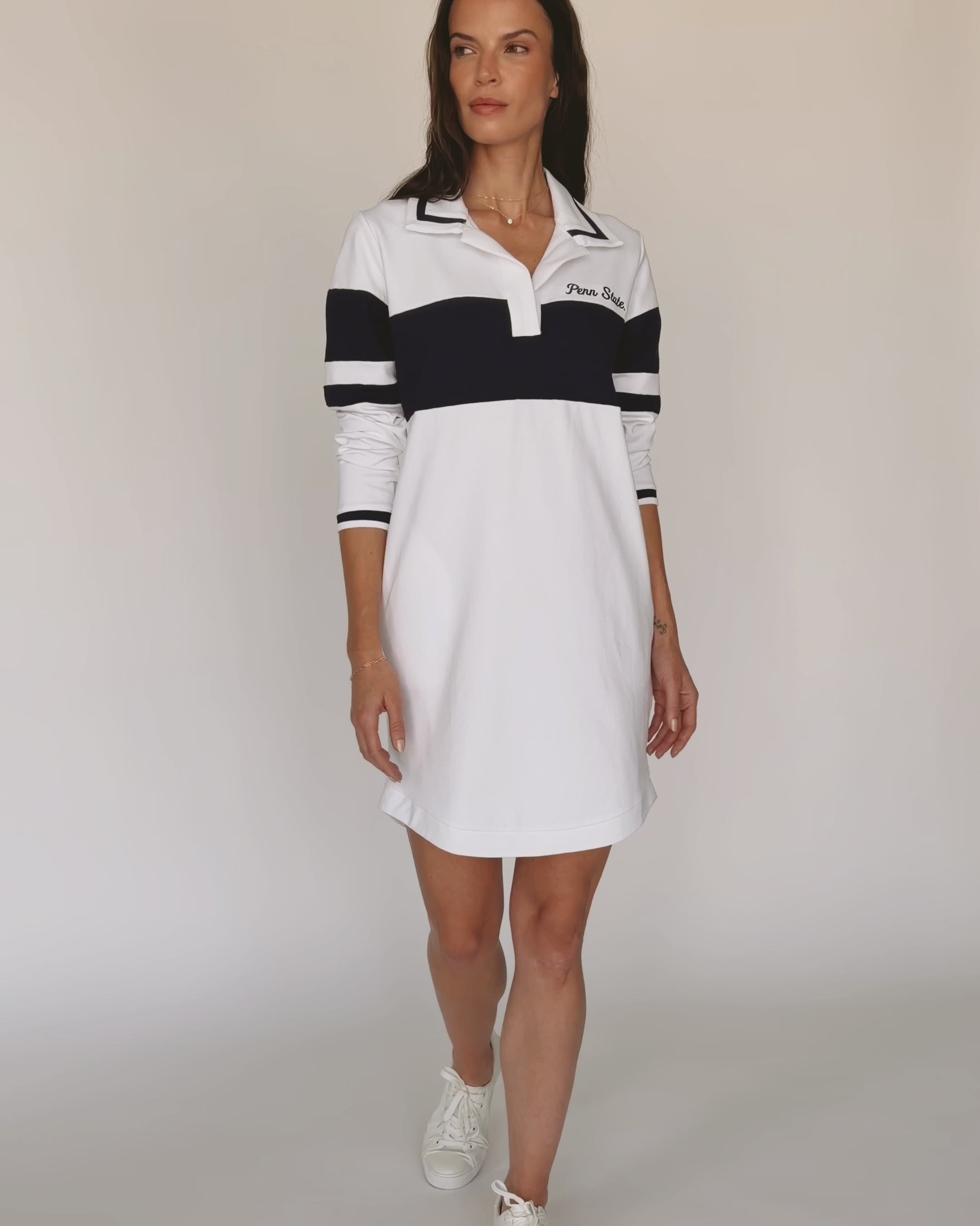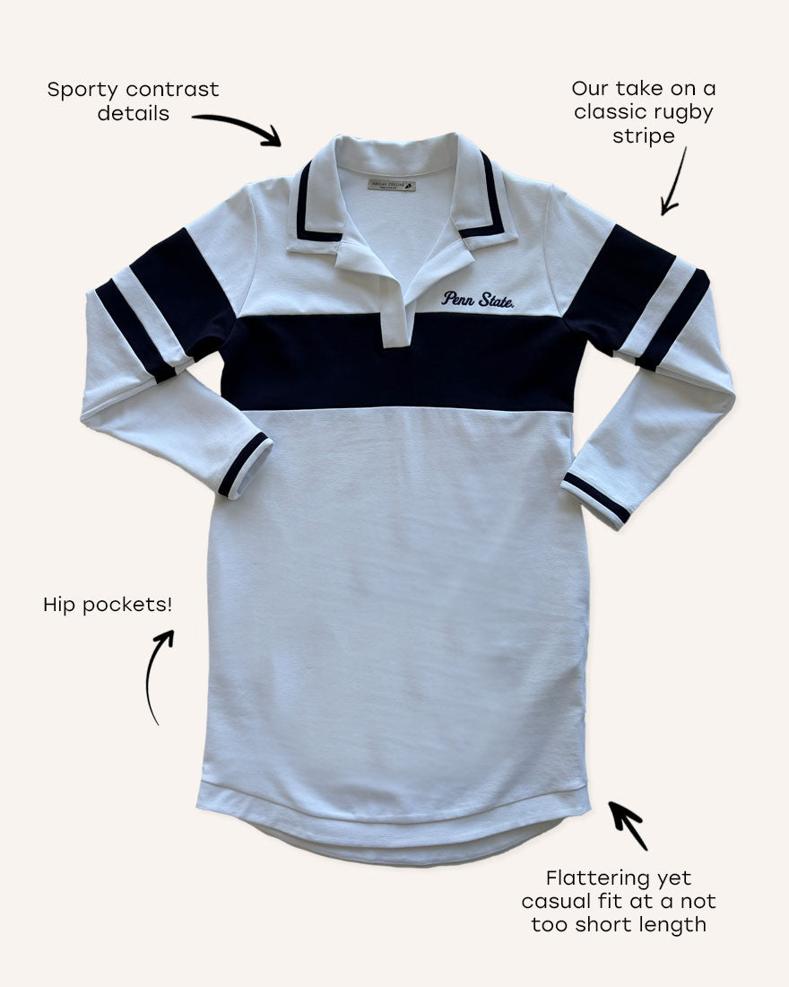 This rugby-inspired polo dress is designed for effortless wear from tailgate to town. Featuring bold contrast stripes, a tipped collar, and a curved hem, it’s crafted in mid-weight ponte that’s as comfortable as your favorite sweatshirt yet structured enough to hold its shape. With hidden pockets and an easy pull-over silhouette, it’s the true throw-on-and-go Penn State essential you’ll reach for on repeat.