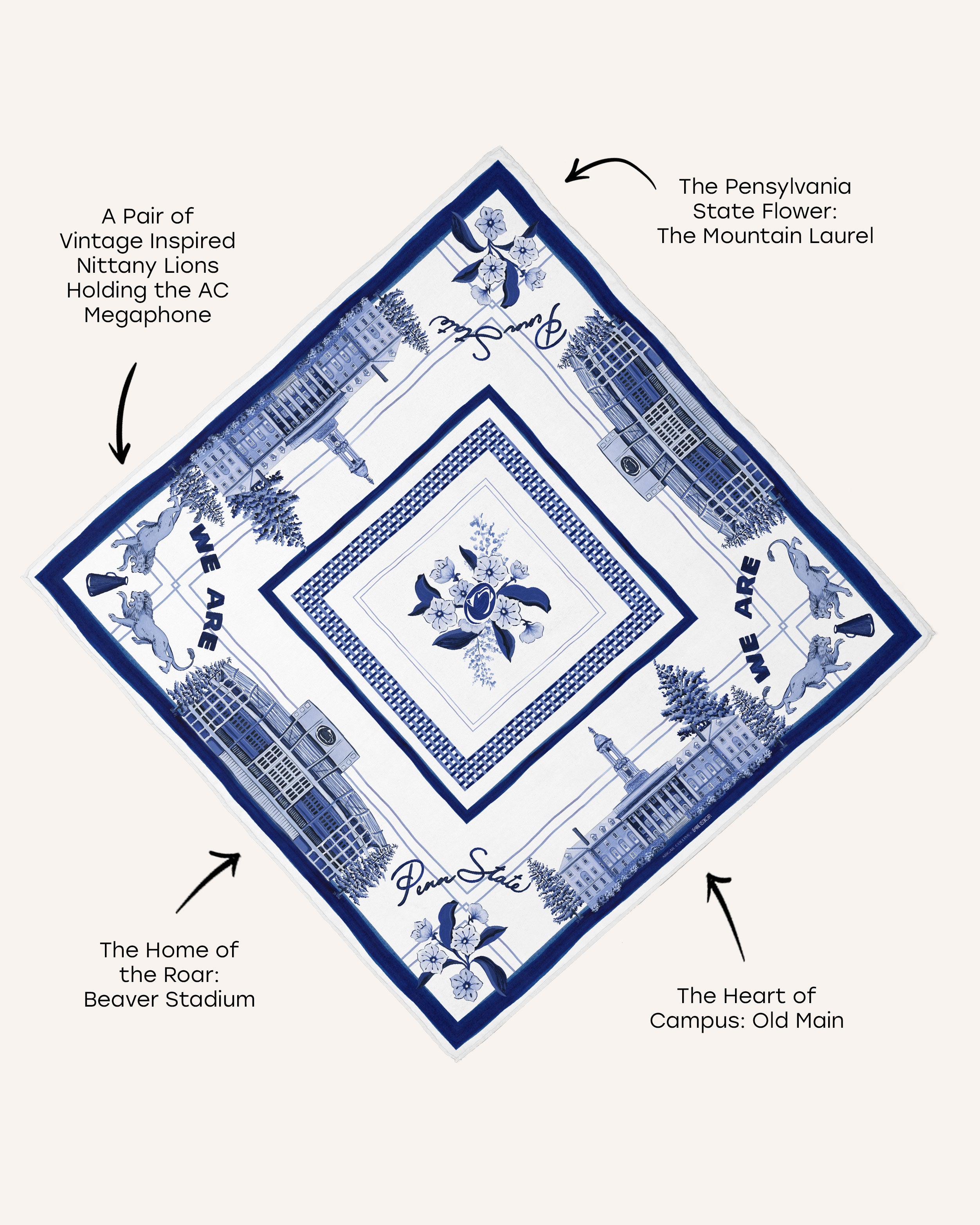 Our first-ever artist collaboration features a hand-drawn design by Los Angeles-based textile artist Leanne Kissinger. It showcases State College staples like Old Main, Beaver Stadium, vintage Nittany Lions, and the Pennsylvania state flower, Mountain Laurel.