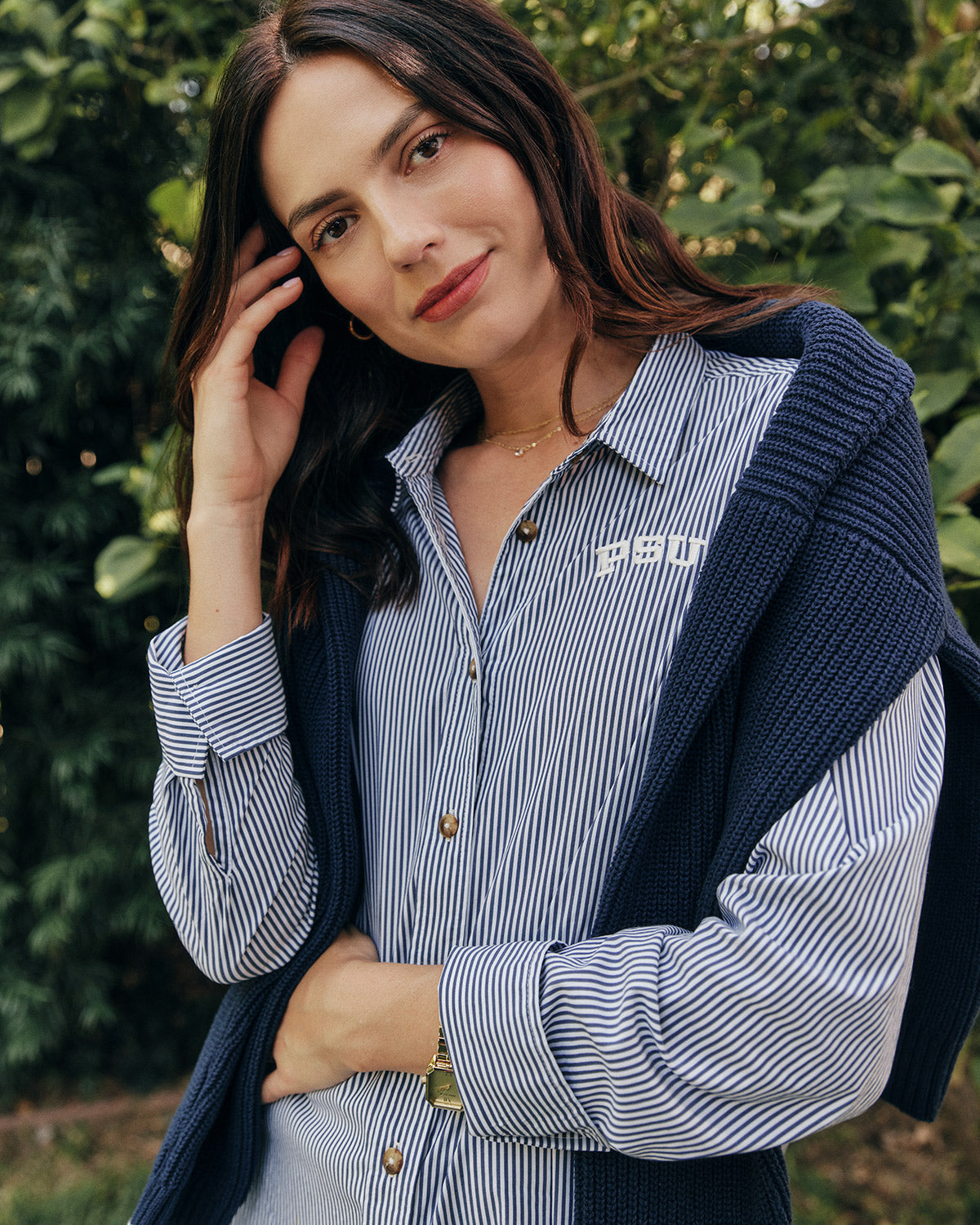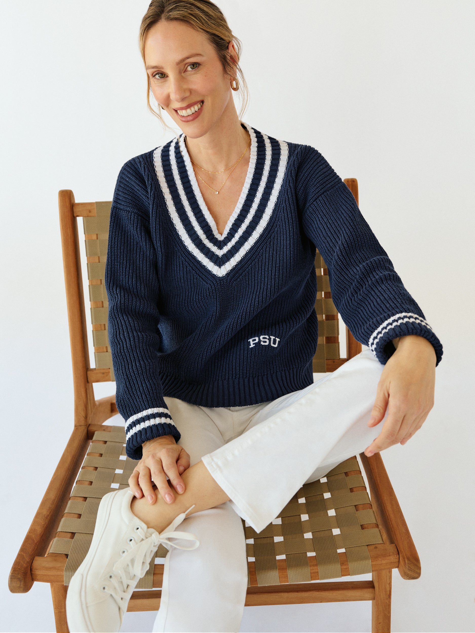 For those chilly September game days, our V-neck sweater offers a slightly longer sleeve for added warmth, drop shoulders for a relaxed fit, and a flattering not–too-deep neckline. Pairs perfectly with our long button up for easy chic layers.
