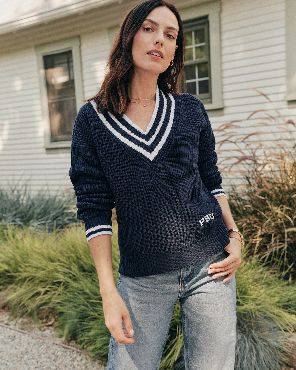 For those chilly September game days, our V-neck sweater offers a slightly longer sleeve for added warmth, drop shoulders for a relaxed fit, and a flattering not–too-deep neckline. Pairs perfectly with our long button up for easy chic layers.