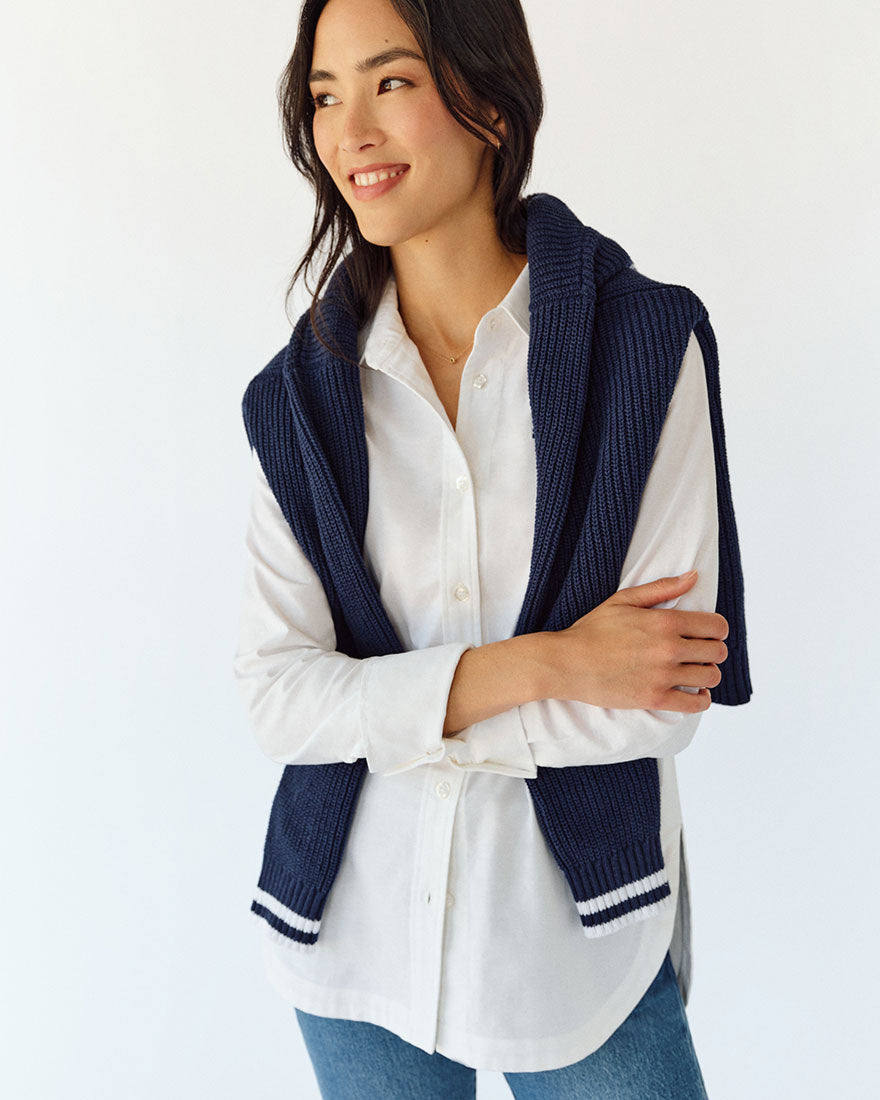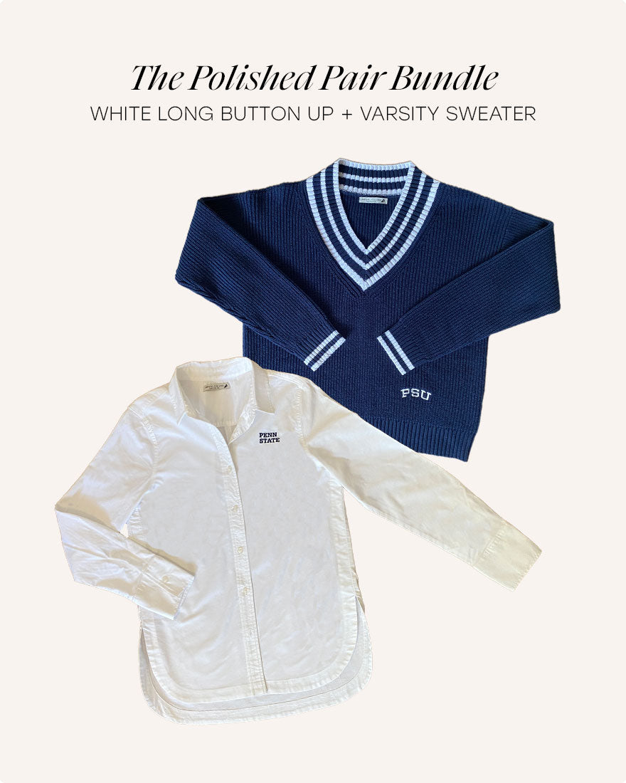 The gift of elevated essentials. Our Polished Pair Bundle combines two of Abigail Collins’ most iconic pieces: the crisp Long White Button-Up and the relaxed Varsity Sweater. Together, they’re a timeless duo designed to layer effortlessly and gift beautifully. Crisp, classic, and endlessly versatile.